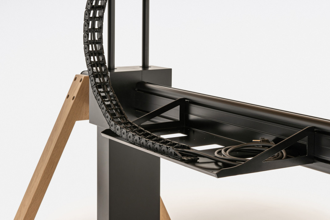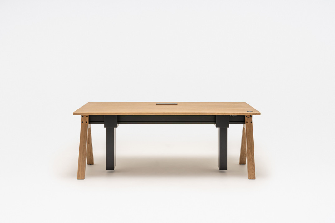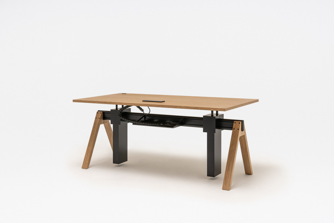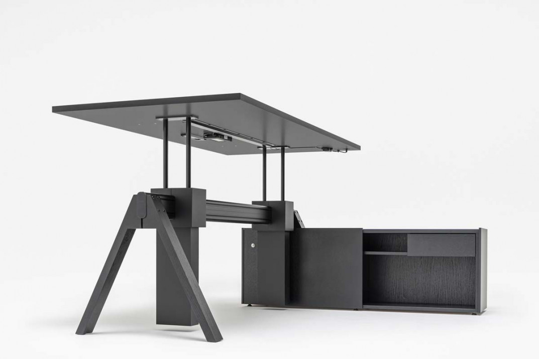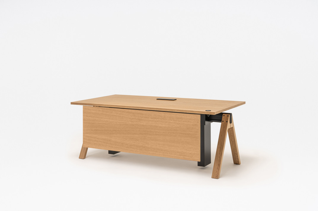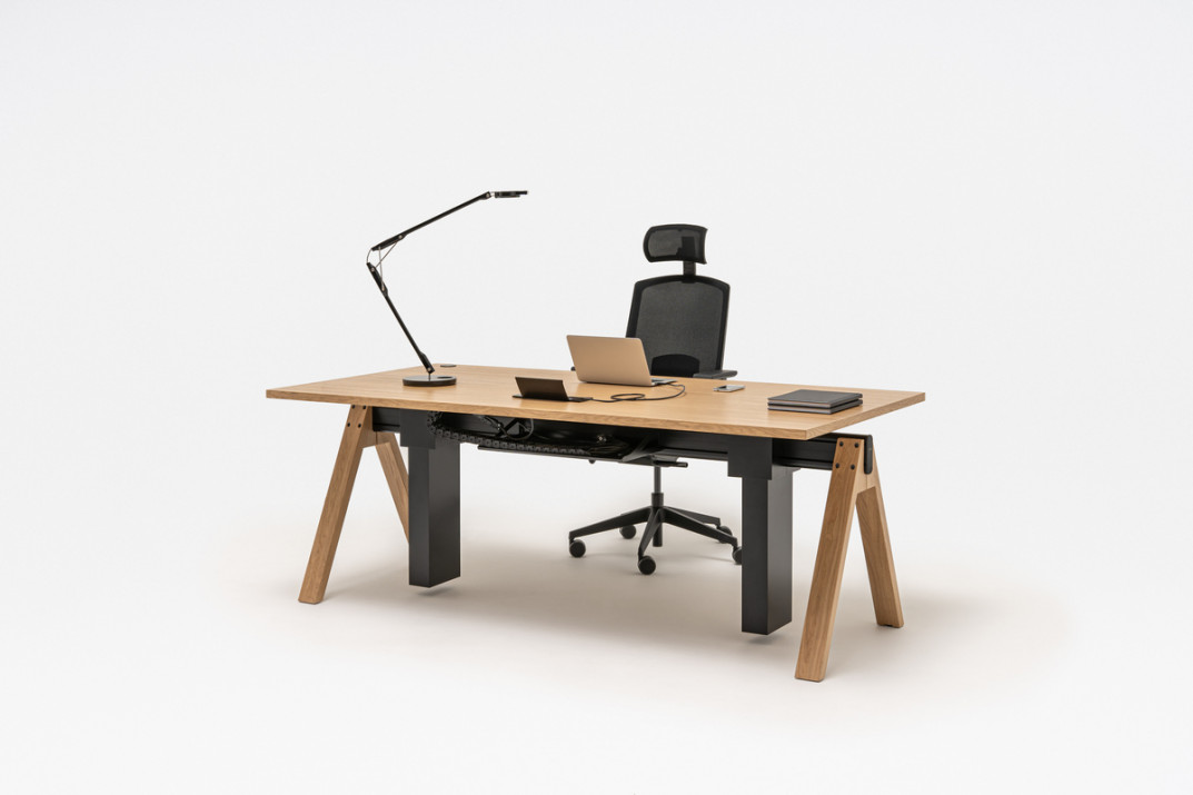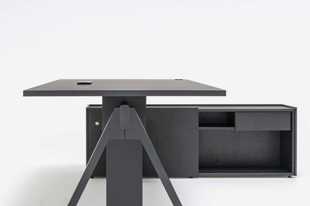 Biurko gabinetowe Viga z regulacją wysokości blatu idealnie uzupełni aranżacje nowoczesnych gabinetów dyrektorskich. Viga ma charakterystyczną formę biurka wspartego na trójkątnych nogach i aluminiowej belce.