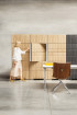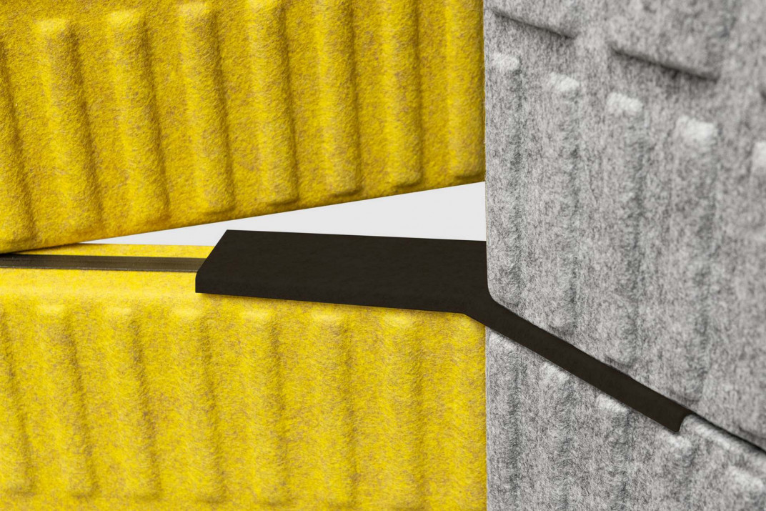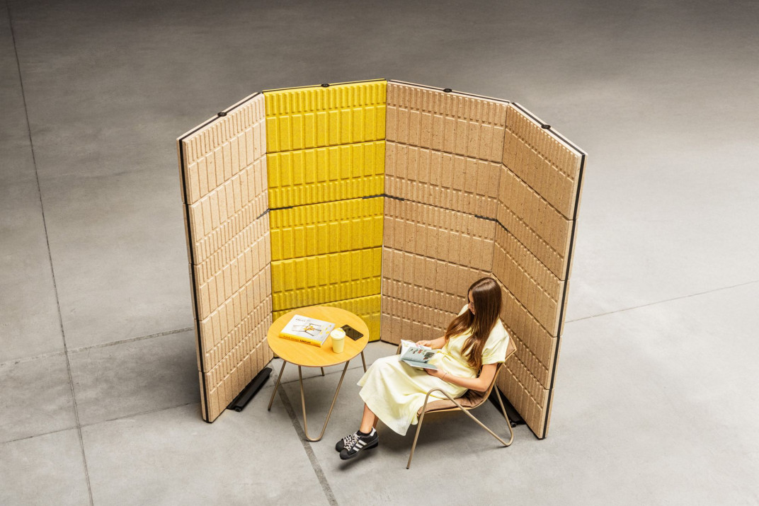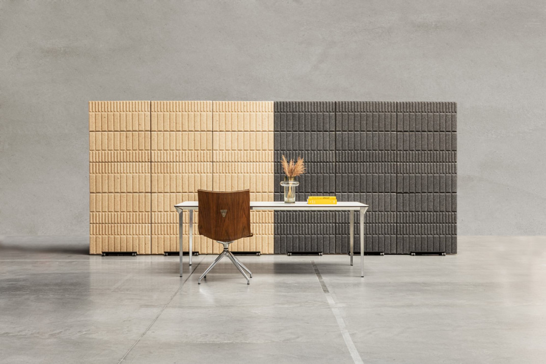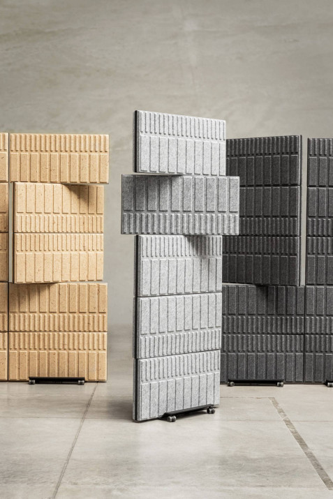 Charakterystycznym elementem kolekcji są panele BRICKS inspirowane kształtem cegły, które nadają wnętrzom architektonicznej wyrazistości i gwarantują doskonałe parametry akustyczne (αw = 0.90). W zależności od potrzeb, panele dostępne są w trzech wariantach materiałowych: z biomateriału (len i konopie), z rPET pozyskanego w procesie recyklingu lub tapicerowane wysokiej jakości tkaniną.