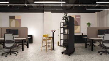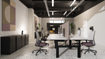 W strefie pracy głównym elementem kompozycyjnym są stanowiska biurkowe ustawione w układzie umożliwiającym wygodną pracę zespołową. Oddzielające je panele filcowe w kolorach nawiązujących do brandu firmy wprowadzają do wnętrza charakterystyczny akcent, a jednocześnie poprawiają komfort pracy. Kolorystyczne odniesienia pojawiają się także w detalach, takich jak tapicerowane siedziska foteli czy elementy dekoracyjne.