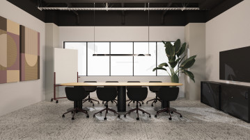 Jadalnia została zaprojektowana jako bardziej swobodna i przyjazna część biura. Tutaj mocniejszym akcentem jest duża sofa w intensywnym kolorze brandowym, która nadaje przestrzeni wyrazisty charakter i sprzyja nieformalnym spotkaniom pracowników. Zestawienie jej z naturalnymi materiałami, jasnym drewnem oraz roślinnością pozwala stworzyć przytulną atmosferę sprzyjającą odpoczynkowi w trakcie dnia pracy.