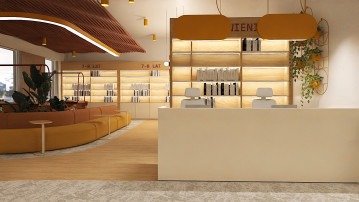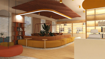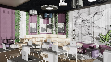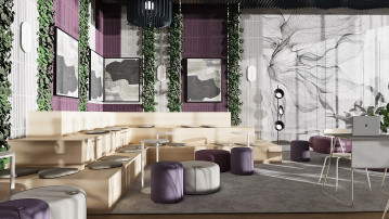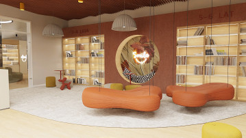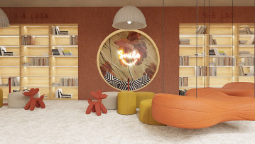 W tej części domu kultury kolor odgrywa rolę pierwszoplanową. Intensywne, ale dobrze zbalansowane barwy porządkują strefy funkcjonalne, budują energię wnętrza i wpływają na jego emocjonalny odbiór. Zestawienie ciepłych odcieni z naturalnymi materiałami oraz miękkimi formami mebli tworzy środowisko, które pobudza wyobraźnię, a jednocześnie nie przytłacza. Całość dopełniają detale graficzne i oświetlenie, podkreślające warsztatowy, otwarty charakter tej przestrzeni.
