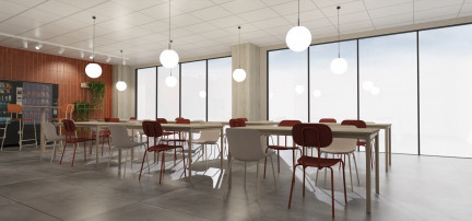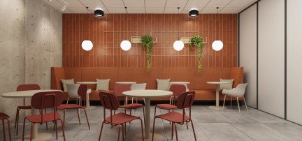 - pomieszczenie socjalne i kantyna stanowią przytulne miejsca integracji, gdzie ciepła kolorystyka i miękkie tkaniny zachęcają do odpoczynku,