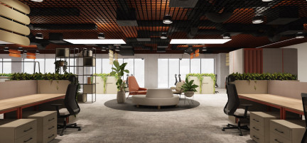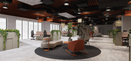 - centralnym elementem projektu jest open space, uzupełniony o strefy wypoczynku z miękkimi siedziskami i roślinnością,