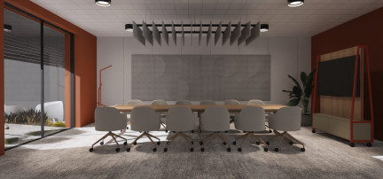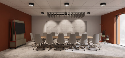 - sale konferencyjne zaprojektowano z myślą o komforcie spotkań – zastosowano panele akustyczne oraz duże stoły sprzyjające pracy zespołowej,