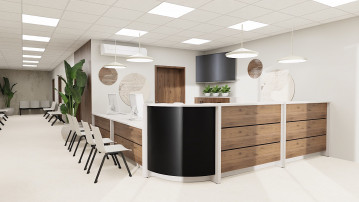 Podstawowym założeniem projektowym było zaprojektowanie ergonomicznej, intuicyjnej w odbiorze strefy wejściowej, która usprawnia pracę personelu oraz zapewnia komfort pacjentom. Lada recepcyjna została zaplanowana w sposób umożliwiający wygodną obsługę, odpowiednią organizację stanowisk komputerowych oraz zachowanie prywatności podczas rejestracji.