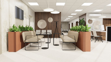Druga wersja wnętrza ma bardziej wyrazisty, elegancki charakter. Recepcja w kolorze orzecha zestawiona została z jasnymi krzesłami i sofami, co pozwala zachować równowagę pomiędzy głębią barw a lekkością przestrzeni. Ciemne donice i mocniejsze akcenty materiałowe nadają wnętrzu prestiżowego tonu. Ta odsłona projektu sprawdzi się w placówkach, które chcą zaakcentować nowoczesność, stabilność i profesjonalny wizerunek.
