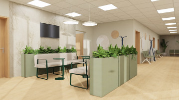 Pierwsza koncepcja opiera się na jasnej, dębowej recepcji oraz naturalnej, ciepłej kolorystyce. Jasne sofy, zielone krzesła i roślinność wprowadzają do wnętrza lekkość oraz wrażenie świeżości. Dominują tu miękkie beże, złamane biele i naturalne drewno, które w połączeniu z subtelnym oświetleniem tworzą przyjazne, kojące środowisko. To propozycja dla inwestora, który chce podkreślić otwartość i dostępność placówki oraz stworzyć atmosferę sprzyjającą wyciszeniu przed wizytą.