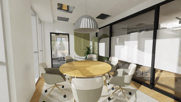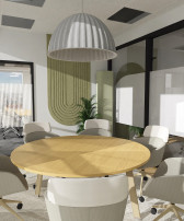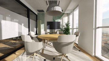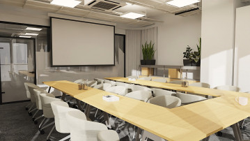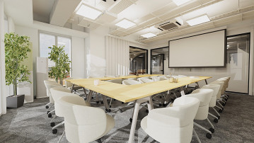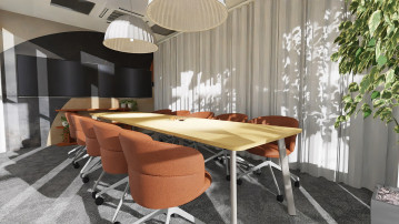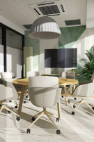 Rozbudowany układ sal konferencyjnych odpowiada na zróżnicowane potrzeby spotkań. Kameralna sala 6-osobowa została zaprojektowana w stonowanej, pastelowej kolorystyce, sprzyjającej skupieniu i spokojnej pracy. Z kolei sala 10-osobowa, utrzymana w odcieniach koniaku i pomarańczy, pełni funkcję bardziej dynamicznej przestrzeni do spotkań i wideokonferencji. Największa, 28-osobowa sala konferencyjna została zaprojektowana jako przestrzeń modułowa – z możliwością podziału na dwie niezależne strefy oraz elastyczną aranżacją dzięki mobilnym meblom.