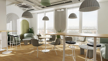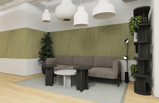 Uzupełnieniem całej koncepcji jest przestrzeń open space, w której skupiono się na zapewnieniu komfortu pracy indywidualnej mimo otwartego charakteru wnętrza. Kluczową rolę odgrywają tu budki akustyczne Jetson, które tworzą wydzielone strefy do rozmów telefonicznych, wideokonferencji czy pracy wymagającej skupienia. W połączeniu z filcowymi obudowami wnęk oraz panelami wiszącymi przy biurkach rozwiązania te skutecznie poprawiają akustykę i organizację przestrzeni.