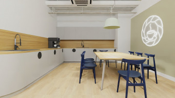 Istotnym elementem koncepcji jest także strefa coffee point (Town Hall), zaprojektowana jako miejsce integracji i nieformalnych spotkań. Różnorodność zastosowanych mebli – od sof i foteli, przez klasyczne stoliki, aż po wysokie stoły z hokerami – pozwala na swobodne dostosowanie przestrzeni do aktualnych potrzeb, w tym organizacji przerw cateringowych czy prezentacji.