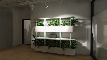 Centralnym punktem części reprezentacyjnej jest recepcja z charakterystycznym, modułowym regałem wypełnionym roślinnością. Ze względu na ograniczony dostęp światła dziennego zastosowano specjalistyczne oświetlenie wspierające ich wzrost, co pozwoliło stworzyć efekt „zielonego serca” tej części biura.